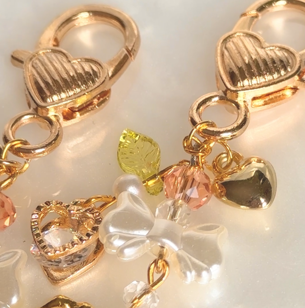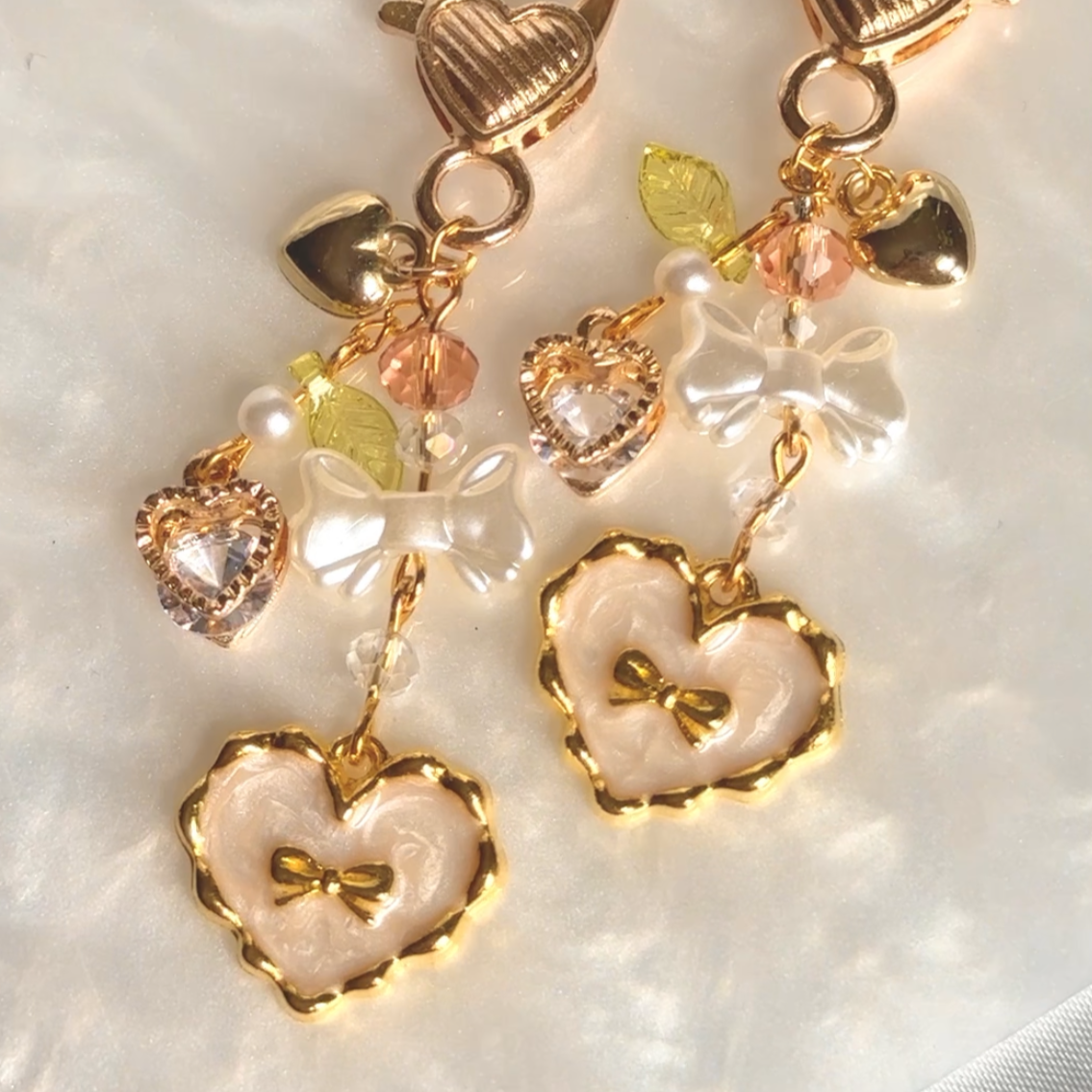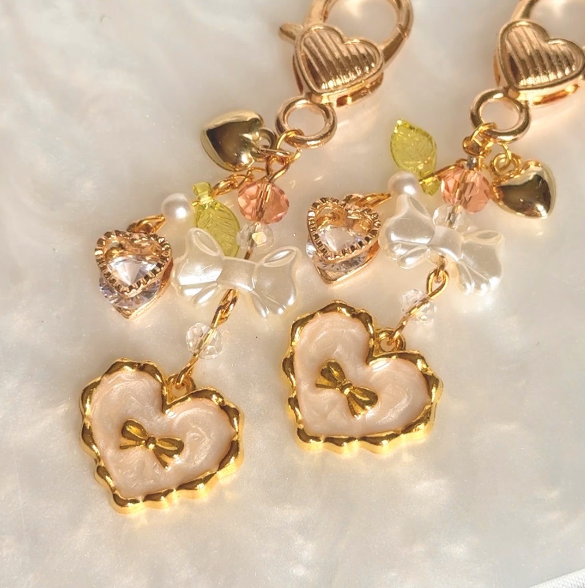 Our Coquette Love ᡣ𐭩 •。ꪆৎ ˚ keychain is handmade with pearly bows and adorned with gold hearts. It includes a limited edition heart clasp that is available only in this collection. Coquette Love can be shared as matching keychains with anyone you choose <3 They're perfect as a bag accessory, wallet charm, or keychain.