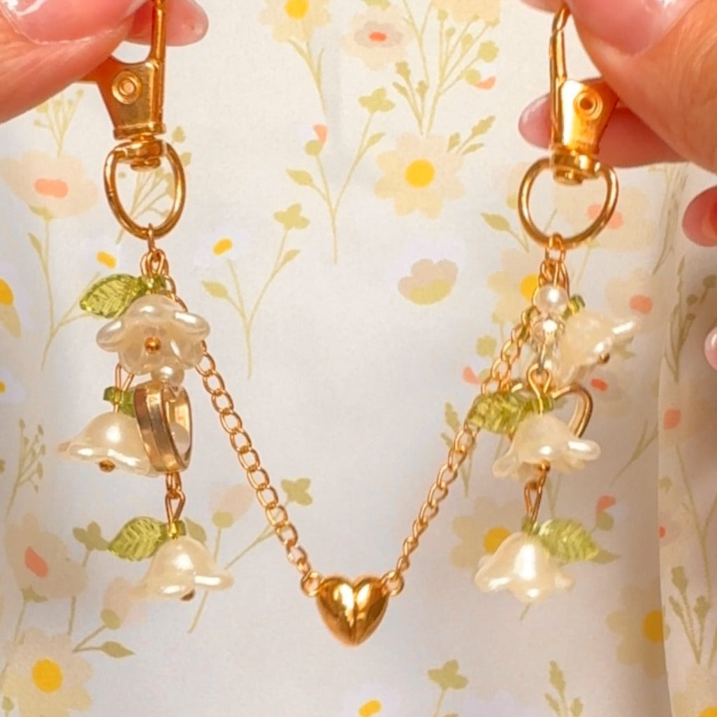 Handmade Lovers dangling earrings by Matchigraphics using selenite crystal beads, clear beads, and shiny teardrops. The crystal inside the heart is moveable!